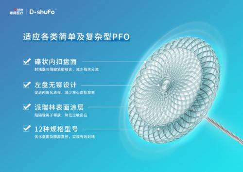 在产品创新性方面,D-shufo 经过精细的工艺优化,实现碟状内扣盘面设计,赋予了其稳定的夹持性能,提高治疗成功率。其表面覆盖的派瑞林涂层,有效抑制了镍离子的释放,提升患者远期安全性。此外,D-shufo 卵圆孔未闭封堵器还采用了左盘无铆设计,有助于促进内皮化进程,从而有效降低左心血栓的发生风险。更为值得一提的是,其规格型号的多元化,满足了不同患者的个性化治疗需求,为治疗的精准性提供保障。