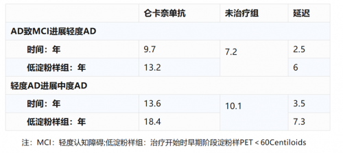 3期临床研究Clarity AD开放标签扩展(OLE)和16个单抗治疗AD临床研究数据估算10年长期AD进展和基线仑卡奈单抗延缓疗效——AD导致MCI进展至轻度AD延迟2.5年,轻度AD进展至中度AD延迟3.5年(如下图所示)。这表明,早期启动和长期使用仑卡奈单抗可能持续减缓AD进展,并帮助更长时间维持认知功能。