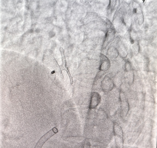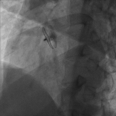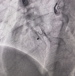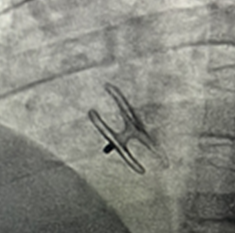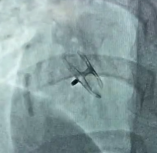 卵圆孔隧道长7.3mm,裂缝直径1.3mm,可见左向右分流。应用D-shufo 1824-3 PFO封堵器成功封堵。