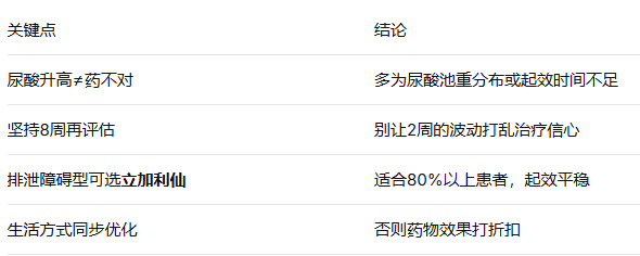 突然停药可能导致尿酸“反跳性”升高,甚至诱发急性痛风。坚持服药至少8周再评估疗效。