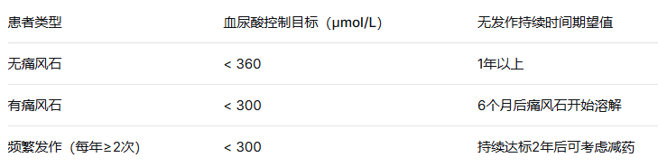 触发调整:连续两次血尿酸>480μmol/L,或一年内发作≥2次,应启动或加强降尿酸治疗。